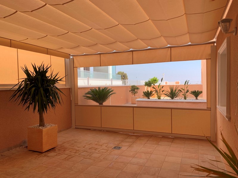 En nuestros cerramientos con pérgolas de aluminio o pvc utilizamos una combinación de toldo plano corredero y toldo telón de altas prestaciones.