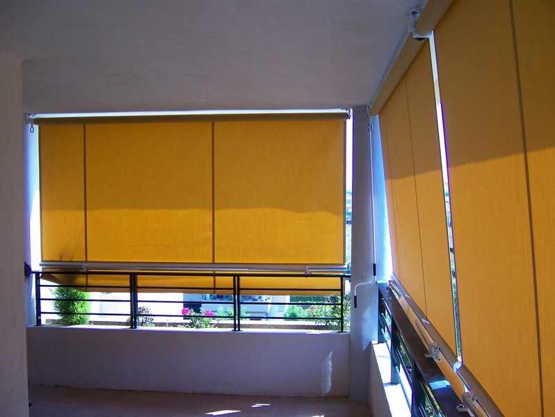 Es un toldo pensado principalmente para terrazas abiertas. Se sujeta al techo y a la barandilla. Consta de unos brazos pequeños de 50 cm de largo fabricados en aluminio, situados en la barra de carga, y que engancha en la barandilla por medio de una pieza fijada a esta.